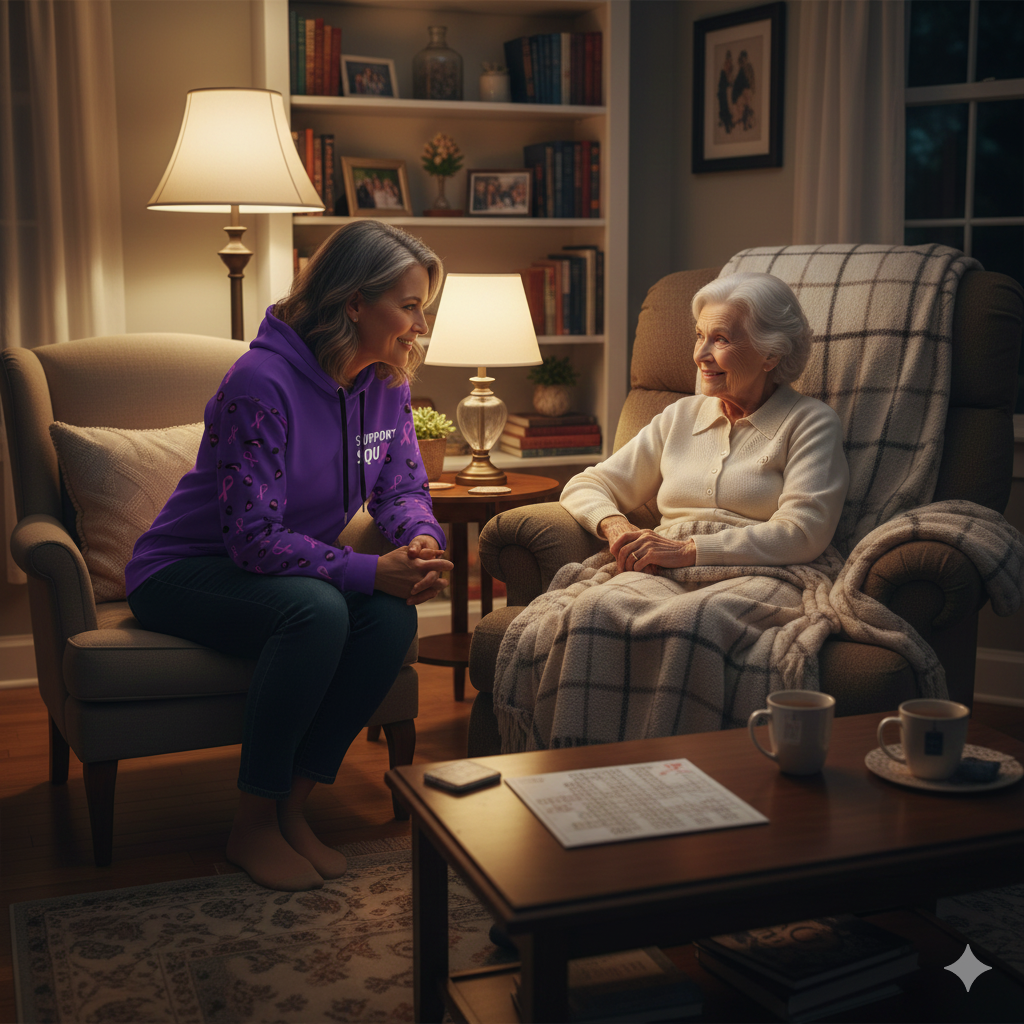 This stylish purple Alzheimer's Awareness hoodie features an original all-over print design that honors the "support squad" - the hardworking caregivers who tirelessly care for loved ones with dementia. Show your gratitude and gift them with something special to show they are appreciated. Join the squad and show your support today!
