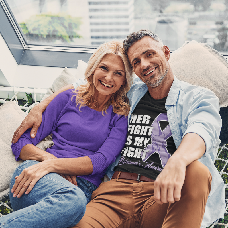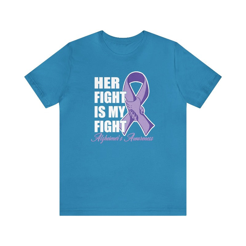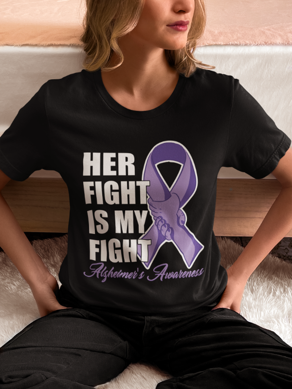 Raise awareness for Alzheimer's with our "Her fight is my fight" T-shirt. Perfect for caregivers and families affected by this disease. Show your support and remind those with dementia that they are not alone. Join the fight today.